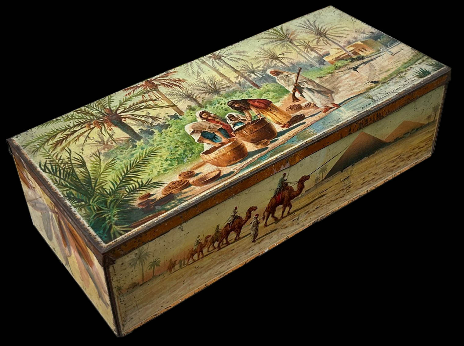 Il giorno prima avevo acquistato questa scatola che raffigura un'oasi all'interno della quale delle donne armeggiano con dei recipienti d'acqua e frutti ad essiccare dentro grandi vassoi in prossimità del bene supremo placido che da a tutti la vita. Le donne appaiono sicure del fatto loro, forse per la padronanza di un mestiere che è insito nelle palme che costituiscono l'area altrimenti deserta, forse perchè presente a proteggerle un uomo armato. Mi piace notare che anche questa scatola appartiene al territorio palermitano sia pur per un concetto non legato ai luoghi descritti e nemmeno al clima per certi aspetti parificabile. L'unione è data da una grande committenza, non immediatamente scorgibile. Non dunque i Caflish della omonima pasticceria della scatola perduta, quanto piuttosto i Florio, famiglia onnipresente nelle attività commerciali di un certo spessore che, con questo contenitore, aprivano anche alla commercializzazione dei datteri.