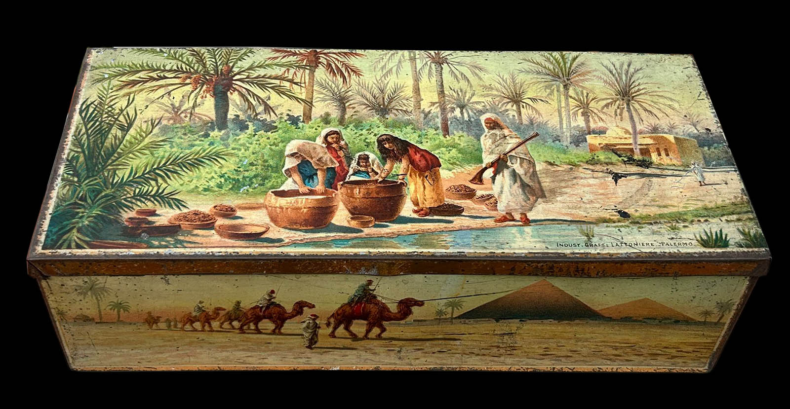 28 ottobre 2025. Ho lasciato andare ad un'asta, per scarsa convinzione, una non rara, ma bellissima, scatola di cassata Caflish, con donna a figura intera e, sullo sfondo, l'icastico panorama del Monte Pellegrino. Per il resto, sui due lati corti si vedono immagini incontrovertibili di succosi datteri. Sui due lati lunghi invece una quasi altrettanto lunga carovana di dromedari con uno sfondo di piramidi che, se non arrivano all'altezza del Monte Pellegrino, lo sovrastano per importanza, non per longevità, poiché il Monte era già abitato nel Paleolitico superiore.