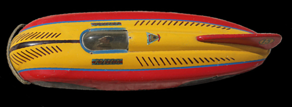 Si tratta di una vettura aerodinamica monoposto a cabina chiusa riportante sulla pinna stabilizzatrice un numero 13 che prefigura una gara tra più concorrenti. I tempi delle gare a cronometro contro se stessi ai fini dei primati più disparati, già in auge dai primi anni del secolo, continuarono a registrare record su record nel dopoguerra ed alimentavano l'inventiva e la fantasia dei bambini di quegli anni . L'immaginazione che impegnava le menti dei giovani ragazzi aveva in realizzazioni come questo gioco una perfetta e completa corrispondenza con le riviste di scienza e tecnica, parche di immagini e foriere di notizie. Questo giocattolo italiano della gloriosa marca VENTURA ne è testimonianza. Misura 47 cm di lunghezza. La pinna posteriore ed il fondo sono in legno. Il corpo vettura in alluminio stampato. Decalcomanie applicate sui laterali ed in alto con l'inconfondibile marchio a triangolo rovesciato con il ragno stilizzato. Funzionamento con carica a molla a chiave estraibile. Da questo pomeriggio in collezione. Fila come una FRECCIA!