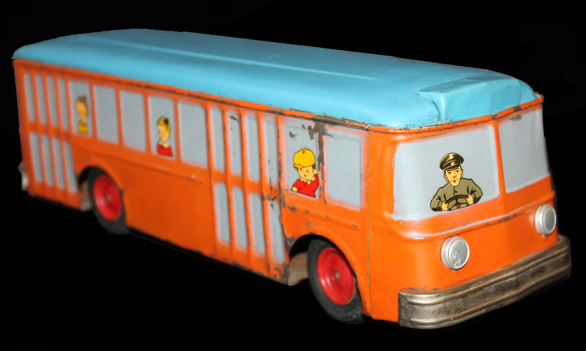 1) La scimmietta BOBBY che si arrampica sulla corda è stata realizzata dalla ALEMANNI ed è la versione italiana della più nota TOM CLIMBING MONKEY inventata nei primi del secolo dalla tedesca LEHMANN. 2) L'asinello PENNY TOY non ha meccanismo. Avevo sulle prime pensato che si trattasse della versione INGAP. Credo però dalla dimensione delle ruote che si tratti di gioco tedesco. Facendo i dovuti raffronti con la copia italiana ho appurato che è completamente diverso. 3) Il suonatore di sax ha un meccanismo semplice che si aziona dal retro tramite la pressione di un fil di ferro che agisce sugli arti e sugli occhi. Sistema simile a quello dello Charlot di cui ho parlato nello scorso mese di aprile. Sembra tedesco, della DISTLER. Ma è diverso per litografia dal tedesco e non reca la scritta MADE IN GERMANY. Penso che possa anche trattarsi di una copia italiana. 4) Infine il grosso treno con il numero 212 inscritto in un rombo ed in un quadrato. Ha un meccanismo che permette al treno di andare avanti ed indietro a scatti regolari. Ricorda quello del BULKY MULE LEHMANN, ma è diverso d'aspetto poiché non ha un ingranaggio rotondo con due interruzioni poste a 180 gradi l'una dall'altra che ne consente l'inversione di marcia, ma un ingegnoso sistema collegato alla ruota primaria tramite un braccetto che oscilla in modo asimmetrico su un ingranaggio trasportatore dentato rettilineo. L'effetto del movimento è identico, il meccanismo meno efficiente, perchè molto debole. Non è marcato e per questo non escludo che si tratti di fabbricazione italiana. Costituisce per me l'oggetto più interessante di tutto l'acquisto.