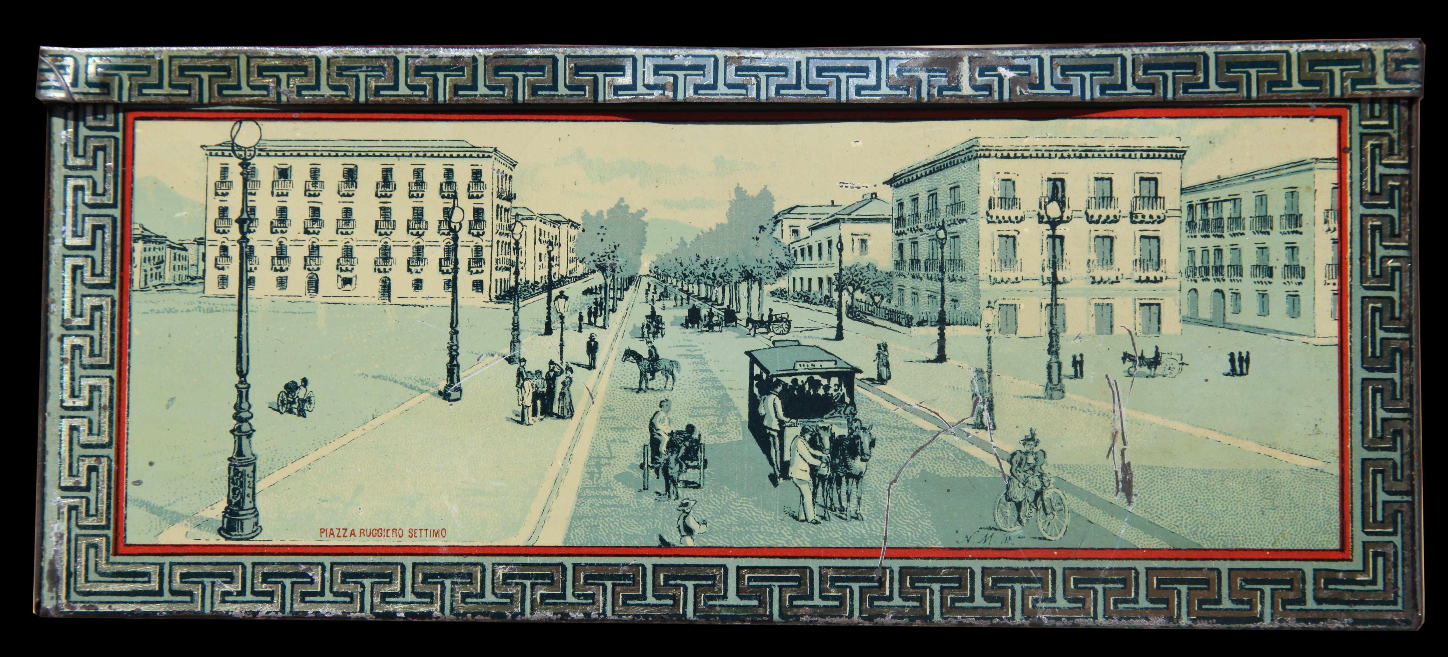 Della promozione e della generosità entrano in gioco i lati delle scatole. Cominciamo dalla scatola di fine ottocento per biscotti della Peek Frean & Co di Londra. La possiedo da qualche tempo avendola acquistata su un sito di aste internazionale, ma che ho poi io stesso ritirato tramite un caro amico dal venditore palermitano. Questo dato ha anche il suo peso, oltre che essere coincidenza con il resto del racconto. Mi aveva attratto molto per l'affascinante vestito regionale della donna che portava con se una gerla di vimini su un braccio, che è risultata poi essere ad una più attenta analisi una gabbia per uccellini, sulla testa una brocca di terracotta per liquidi, un ombrello chiuso (forse necessario più difendersi dal solleone che da occasionali piogge). La scatola straniera di per se non costituirebbe per me motivo d'indagine e di interesse, ma noto sempre più che la collezione di soli oggetti italiani è ormai (non solo per effetto della globalizzazione) divenuta retaggio di provincialismo e di chiusura di mente. Le immagini che caratterizzano i lati delle scatole ricordano i quadri di Antonino Leto, di Francesco Lojacono, a me più noti in quanto siciliani, ma anche di tanti pittori italiani che vivevano in prossimità di marine e che riuscivano ad immortalare luce e attimi di vita aulica con estreme doti di sintesi ed ironia al tempo stesso. La scatola nasce a Londra, ma il paesaggio è prettamente italiano, si scorgono momenti di produzione e di "trasporto" con barche a vela di grossi frutti arancioni, che vengono poi trasportati per le calle di Venezia tramite una chiatta che ricorda una gondola, ma che non dispone del ferro di prua con il cappello del Doge. La scatola a mio avviso nasceva per stare nei salotti inglesi dove ci si aspetta di sapere degustare ottimi darjeliing delle colonie indiane. Perciò a chi si chiederà se immagini di baffi neri e mandolini potessero completare la visione d'insieme, devo rassegnare unicamente la presenza di una bimba con tamburello ed organetto con scimmia. Ma adesso occorre aggiungere le immagini della scatola di Dagnino che può essere stata realizzata solo dal 1896 perchè di quell'anno è la nascita della pasticceria, in realtà la presenza del Teatro Massimo lo colloca piuttosto nel 1897, anno della conclusione dei lavori.