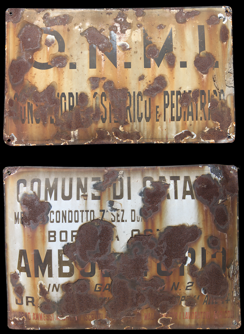 La restante parte della storia di ordinaria carestia (o siccità per questioni di clima) dei mercati siciliani attiene invece questa seconda acquisizione. Qui si parla di insegne smaltate. Per la verità di quello che resta di esse. Un po' come i meccanismi, una parte minore di una cosa più grande. Ho tentato anche di pulirle. Vani i tentativi. Non è rimasto molto. Ma qualcosa di nuovo, che viene dal passato, l'ho imparato ugualmente e questo è il senso costruttivo dell'acquisizione di questi "rottami".