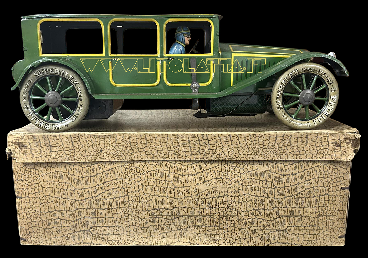 In perfetta corrispondenza con l'idea che sia questo l'anno del vero centenario della LANCIA LAMBDA, accludo oggi alla collezione LITOLATTA questo bel modello di berlina dalla insolita colorazione verde e giallo (vista solo nella torpedo), poichè delle berline si conoscono nella letteratura solo le due colorazioni blu e giallo, o rosso e giallo. Dotata anche di scatola originale con effetto stampato di cuoio di coccodrillo, questa meravigliosa auto giocattolo è dotata di meccanismo a molla e circuito di illuminazione elettrica dei fari e della targa posteriore. Filo sterlingato, batteria a parallelepipedo da 4,5 volts, lampadine ad incandescenza a bulbo schiacciato sono le caratteristiche di bellezza di un tempo passato che permettono di riconoscere i quasi cento anni di età del giocattolo.