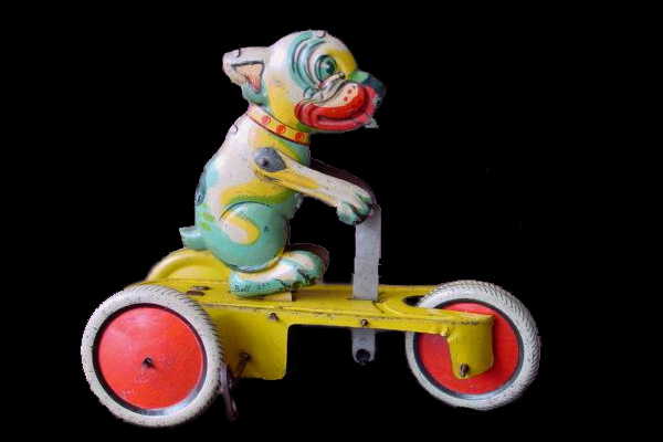 Quattro versioni di gioco triciclo animato a molla: PINOCCHIO, SCOUT, cane BONZO e signor Bonaventura su triciclo.