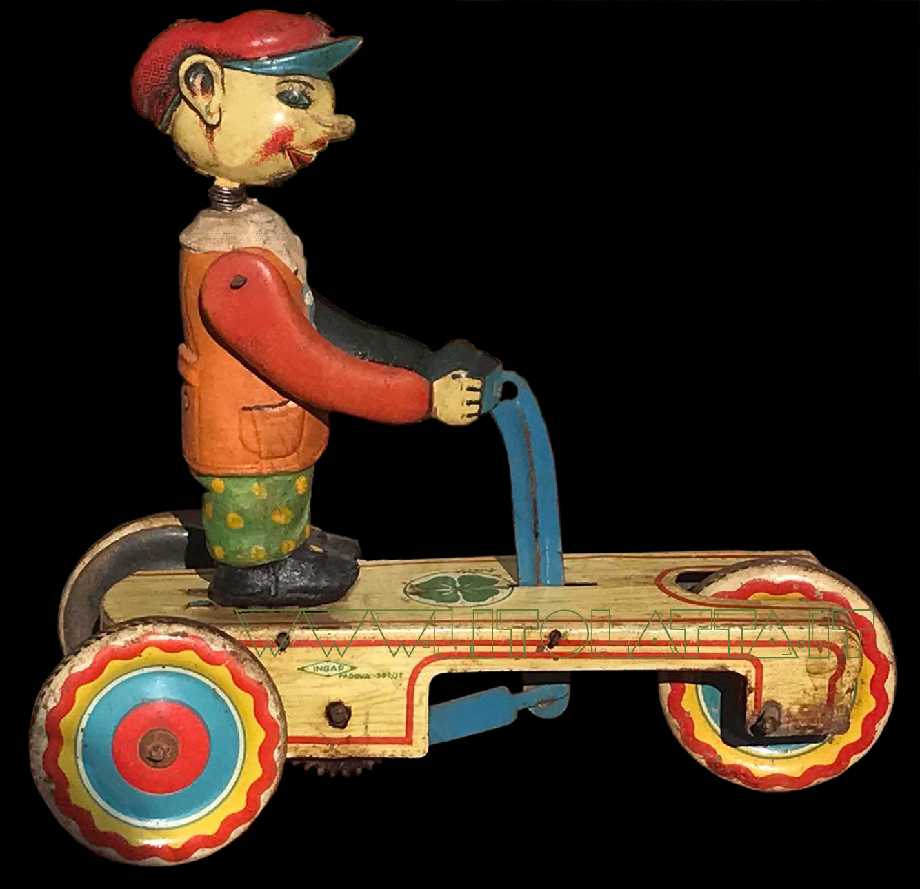 Pinocchio su triciclo nella versione con vestito rosso e pantaloncini blu con le ruote che riproducono momenti della storia. Esiste anche una versione, che ancora ricerco, con il vestito bianco a fiori. Spesso si trovano incompleti, senza le ruote posteriori che hanno una dimensione ben precisa. Oppure con ruote adattate che provengono da altri giocattoli Ingap più comuni, ma più piccole.
